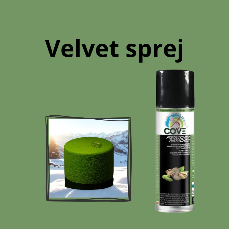 Velvet sprej pistácia je dekoračný sprej určený na striekanie všetkých povrcho - peny, zmrzliny, čokoládu, semifredo alebo akýkoľvek vychladnutý povrch.